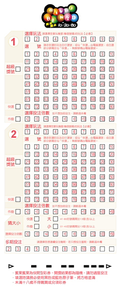 每張「BINGO BINGO 賓果賓果」選號單都有2個選號區(第1組和第2組),每個選號區皆有80個號碼(01~80), 您可以依照自己的喜好,自由採用以下幾種不同的方式填寫選號單,進行投注。
