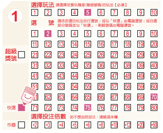 在選號區中,從01~80的號碼中自行填選少於玩法數的號碼,並劃記「快選」,投注機將自動為您選出剩下的號碼。 以下圖為例,如果您選擇「5星」玩法,自選3個號碼—02、70和75,並劃記「快選」,其餘2個號碼將由投注機為您快選產生。